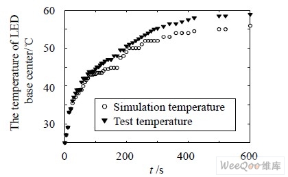 圖3 Lumileds 1W LED 基板中心點溫度實測數(shù)據(jù)與仿真數(shù)據(jù)對比