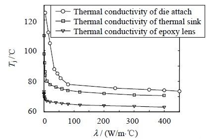 由圖可知,LED 結(jié)溫隨著熱沉和鍵合層導(dǎo)熱系數(shù)的變化趨勢類似,當(dāng)λ 較小時,隨著λ 增大,結(jié)溫迅速降低;當(dāng)λ 較大時,隨著各種材料導(dǎo)熱系數(shù)變化,結(jié)溫變化平緩。這是因為當(dāng)λ 較小時,各材料的熱阻較大,而當(dāng)λ 較大時,熱阻減小,熱量能順利傳出,此時導(dǎo)熱系數(shù)不再是影響整個系統(tǒng)傳熱效果的主要因素。由于LED 傳熱并不經(jīng)過透鏡,所以透鏡的導(dǎo)熱系數(shù)對LED 的結(jié)溫變化影響很小。