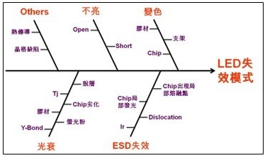 5. 其他:突然間的失效常常是因為熱應(yīng)力所致,當(dāng)環(huán)氧樹脂的封裝達(dá)到玻璃轉(zhuǎn)移溫度(Tg)時,樹脂會很快速的膨脹,在半導(dǎo)體和焊點接觸的位置產(chǎn)生機(jī)械應(yīng)力來弱化或扯斷它,而在非常低的溫度時則會讓封裝產(chǎn)生裂痕。 此外,高功率LED對電流的擁擠敏感,不均勻的電流密度分布在接合點(junction)上,可能會產(chǎn)生局部的熱點,存在熱燒毀的風(fēng)險,若再出現(xiàn)基板的熱傳不均勻,將使問題變得更嚴(yán)重,這常見于銲接材料的孔洞或是電子遷移效應(yīng)和Kirkendall空洞,故熱燒毀亦是LED常見的失效模式。