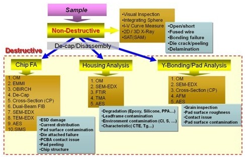 從上可知,一個LED產(chǎn)品的失效,起因可能來自于該產(chǎn)品的任何一個部份,故必須抽絲剝繭方能找到真正的失效原因。針對失效來自LED燈粒而言,因完整的LED燈粒中,LED chip本身很強(qiáng)壯,但包復(fù)chip的封裝材料則易遭受損傷,因此,LED燈粒的失效多可歸因于封裝材料的破壞或劣化所導(dǎo)致。若要充分解析這類失效,牽涉到光學(xué)、化學(xué)、材料學(xué)、電子物理學(xué)等領(lǐng)域的專業(yè)知識,并搭配精密的儀器與豐富的實務(wù)經(jīng)驗,才能確認(rèn)失效點并推導(dǎo)真因,進(jìn)而提出改善對策。