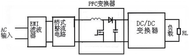 本文所設計電路主要分為EMI模塊、PFC變換器和DC/DC變換器三個部分,其中EMI模塊采用雙環(huán)濾波,達到了較理想的效果;采用飛兆FAN6961芯片作為PFC變換器的控制芯片,使用Boost變換,使功率因數(shù)得到提高;DC/DC變換器采用LLC諧振,以FSFR2100為控制器件,達到了較高的效率,其基本結構如圖1所示。