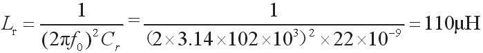 如圖7振蕩器的典型電壓增益曲線所示,選取諧振頻率為102kHz,并且在上一步中已經(jīng)得出Cr=22nF,將這兩個參數(shù)代入式(11)就可以得到: