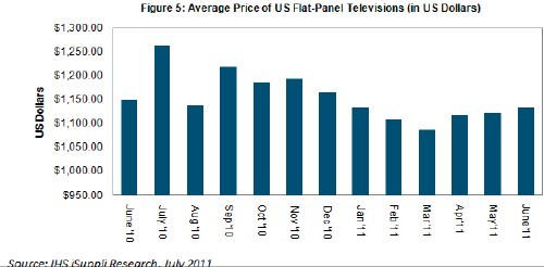 6月份平板電視的平均價格達(dá)到1133美元,比5月的1123美元上漲10美元或0.9%。液晶電視的整體平均價格上漲5美元至1050美元,而上月等離子價格則穩(wěn)定在1590美元。盡管6月價格漲幅不大,但這是4月以來連續(xù)第三個月上漲,而4月之前則是連續(xù)四個月下降。如圖所示。