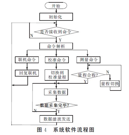 系統(tǒng)軟件采用C語言編寫,在IAR公司提供的集成調試環(huán)境Workbech下采用模塊化思想進行設計。系統(tǒng)的軟件程序固化在MSP430F149單片機的內部Flash存儲器中。系統(tǒng)的程序流程如圖4所示。整個流程可分為初始化、命令解析、數(shù)據(jù)測量、數(shù)據(jù)處理及顯示程序。程序設計借鑒實時操作系統(tǒng)的思想,劃分事件和目標。系統(tǒng)按照工作過程共有命令解析、聯(lián)機、校準、測量判斷、數(shù)據(jù)采集、數(shù)據(jù)打包發(fā)送等幾個事件,通過對事件的處理來完成相應的功能,并進行必要的狀態(tài)轉換。當電壓改變后,接收到測量命令,進入測量狀態(tài),將數(shù)據(jù)發(fā)送并顯示,回到空閑狀態(tài)繼續(xù)等待命令然后進行相應的操作。