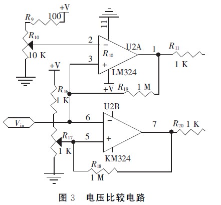 放大后的電壓Vin分別輸入單片機A/D通道和由LM324組成的上下限電壓比較器,根據(jù)比較器輸出分析信號幅度是否在規(guī)定范圍內。為了使電路工作更穩(wěn)定,比較電壓值需預留一定的豁量。如圖3所示,調節(jié)R10使比較上限電壓為2.3V,調節(jié)R17使比較下限電壓為0.1V,當Vin在0.1~2.3V時,量程合適,比較器輸出邏輯電平00,啟動A/D轉換電路。否則,當Vin>2.3V時,通過模擬開關MAX312并配合軟件來切換I/V轉換電路的反饋電阻,向大量程切換;當Vin<0.1V時,向小量程切換,以適應不同強度的光信號。