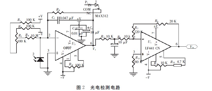 本設計中亮度測量范圍為1×10-3~200×103 cd/m2,為6個數(shù)量級的跳變,單個放大器放大倍數(shù)不能滿足要求,因此需要量程切換。
