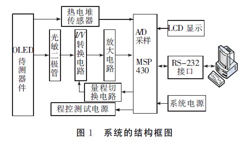 針對以上問題,本文設計了一套基于微控制器的OLED光電性能綜合測試系統(tǒng),系統(tǒng)以微控制器為核心,是一個將精密恒壓(恒流)電源、電壓電流測量、溫度測量、亮度測量有機地結合在一起的測量系統(tǒng),可實現(xiàn)測試條件設置、數(shù)據(jù)存儲、分析、圖形化顯示、打印輸出等功能,實現(xiàn)了對OLED器件光電性能的高精度快速自動測量,使OLED器件的光電性能測試工作變得方便、快捷、科學。