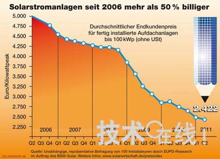 德國太陽能發(fā)電行業(yè)團體BSW-Solar宣布,屋頂設置型太陽能發(fā)電系統(tǒng)2011年第一季度的零售價(包含安裝工程費)降到了2006年的一半以下。