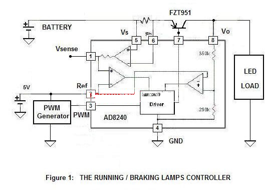 LED的開關(guān)取決于CMOS兼容型PWM引腳(AD8240引腳3)上的數(shù)字電壓。對于簡單的開關(guān)控制,此電壓可以是連續(xù)的;對于調(diào)光控制,此電壓為PWM。PWM頻率應(yīng)低于500 Hz,占空比范圍從5%到100%。典型值為5%(行駛時(shí))和95%(剎車時(shí))。圖2中,PWM頻率由R1、R2和定時(shí)器A1的C1決定。脈沖周期為: