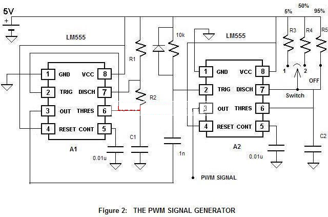 定時(shí)器A2將該信號轉(zhuǎn)換為脈沖寬度調(diào)制信號,后者的占空比由R3、R4、R5和C2決定。脈沖寬度由下式?jīng)Q定:
