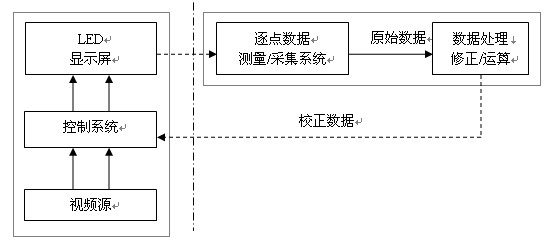 (圖一 注:圖中點劃線左側是顯示屏系統(tǒng),右側是逐點校正數(shù)據(jù)采集與運算系統(tǒng)。)