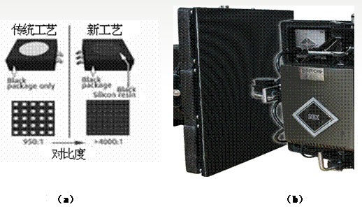 如圖1所示,(a)左側(cè)為傳統(tǒng)工藝的LED發(fā)光管。一般為黑色面碗LED發(fā)光管,管芯為白色。(a)右側(cè)為Barco公司采用新技術(shù),使用黑色管芯,有效提高了對(duì)比度指標(biāo)。(b)圖為采用新工藝的P4間距SMD顯示屏模組。