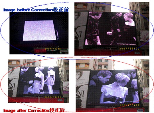 圖3 戶外顯示屏現(xiàn)場(chǎng)校正前后比較