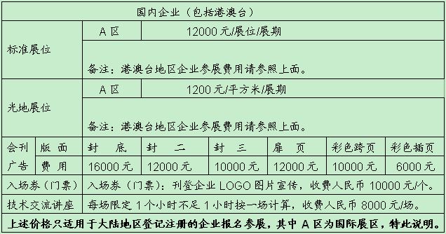 1、標(biāo)準(zhǔn)展位(3m×3m﹦9M2,配置:公司中英文楣牌、展出場地、展位地毯、三面2.5M高圍板、一張洽談桌、二把椅子、一個220V電源插座、兩支射燈。)