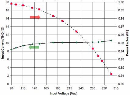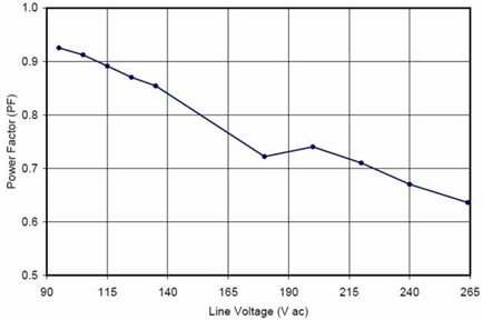 在針對(duì)商業(yè)照明的應(yīng)用中使用的是寬動(dòng)態(tài)范圍的精確導(dǎo)通時(shí)間控制器方案NCL30000。設(shè)計(jì)中采用控制器(外置FET等旁路元件)方案的原因包括易于在能效和成本之間實(shí)現(xiàn)折衷、能以單顆控制器支持寬功率范圍(5到30 W)、及便于優(yōu)化散熱及靈活布線等?;贜CL30000構(gòu)建的90到305 Vac EFD25演示板(Vout = 12 LED, 37 Vdc)測(cè)試顯示,功率因數(shù)遠(yuǎn)高于0.9,部分輸入電壓條件下功率因數(shù)甚至高于0.95(見(jiàn)圖9),能效也極高。