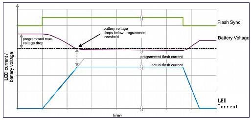如果閃光燈驅(qū)動器本身能夠防止電池電壓下降過多,那么就可以保持較小的安全界限。通過使用一個受控轉(zhuǎn)換率升高 LED 電流,并在上升期間持續(xù)監(jiān)控電池電壓可以實(shí)現(xiàn)這一目標(biāo)。