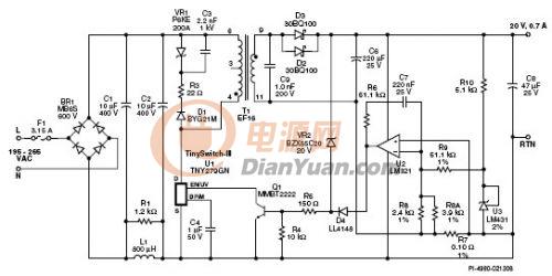 圖1所示為一個典型的20 V、14 W恒壓(CV)、恒流(CV)輸出的電源電路。LED陣列的光輸出量與所流經(jīng)的電流量成正比。因此,LED驅(qū)動器應具有恒流輸出,而不是恒壓輸出。在本設計中,DC輸出未與AC輸入隔離,因而LED陣列和外殼應與用戶安全地隔離開來。