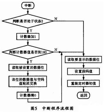 在狀態(tài)2下,參數(shù)設(shè)定時,設(shè)定位要實現(xiàn)閃爍,以確定正在被設(shè)置的數(shù)據(jù)位。實現(xiàn)閃爍的基本思想是每隔500 ms,當(dāng)前閃爍數(shù)據(jù)位的段碼值就由數(shù)據(jù)狀態(tài)變?yōu)榭沾a狀態(tài),下一個500 ms再由空碼狀態(tài)變?yōu)閿?shù)據(jù)狀態(tài),并不斷循環(huán)執(zhí)行此操作(共陽極顯示方式下空碼值為0XFF)。這樣,從用戶角度看,當(dāng)前被設(shè)定的數(shù)據(jù)位就是閃爍的。這里可通過設(shè)定一個計數(shù)器來確定轉(zhuǎn)換時間,當(dāng)計數(shù)值達到500/2.78(約為180)時,當(dāng)前閃爍數(shù)據(jù)位就進行段碼值轉(zhuǎn)換。本系統(tǒng)的中斷程序流程圖如圖5所示。