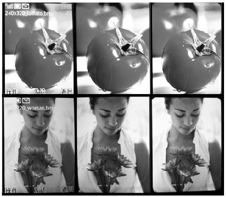 為了能更直觀地比較16bit、18bit 和24bit 的顯示效果差異,特地做了不同位深的手機(jī)顯示效果對比,從左到右分別為1,600 萬色、26 萬色和65,000色,如圖6 所示:在西紅柿的高光部分1,600 萬色色彩過渡平滑、自然,看不到不均勻的顯示,26 萬色的顯示效果稍遜,而65,000 色能明顯看出不均勻的顯示。