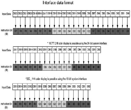 圖4 顯示了圖片的數(shù)據(jù)是怎樣實現(xiàn)灰階的。第一個是典型的24bit 顯示接口,數(shù)據(jù)通過GRAM 后轉(zhuǎn)換成8bit Red、8bit Green 和8bit Blue.同理,18bit 的顯示接口將數(shù)據(jù)轉(zhuǎn)換成RGB 666,16bit 的顯示接口將數(shù)據(jù)轉(zhuǎn)換成RGB 565,繼而混色成0到255 灰階的不同色彩。