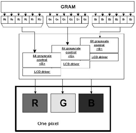 通過嚴(yán)格控制和改變液晶上所施加的電壓,每種子像素呈現(xiàn)不同的灰階。在結(jié)合了這三種子像素后,可以得到一個可以顯示不同顏色的顯示屏。