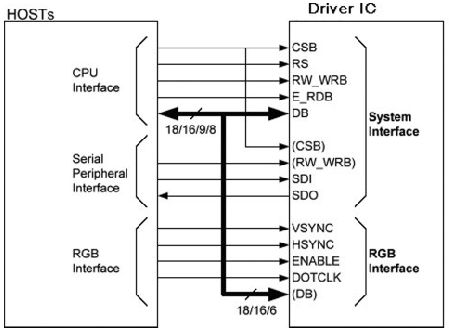 圖2 顯示了一個典型的主控端的連接方式,CS、RS、WRB、RDB 是控制型號,分別是片選信號、數(shù)據(jù)或命令、寫/ 讀信號,按照一定的時序控制,數(shù)據(jù)得以傳輸,畫面才能正常顯示。