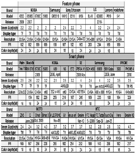圖1 市面上常見手機(jī)的屏幕參數(shù)[page]