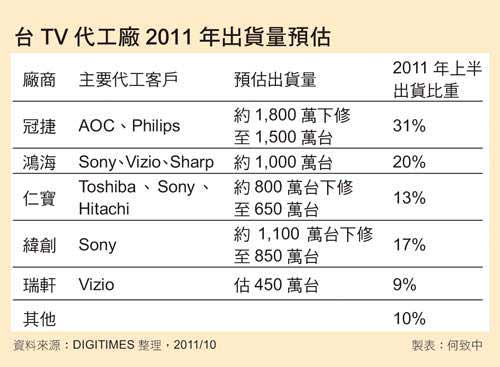 液晶電視制造龍頭冠捷雖握有自有品牌AOC與飛利浦(Philips)品牌訂單,但亦因整體市場需求不佳,下調2011年出貨量,從原先1,800萬臺下修至約1,500萬臺;緯創(chuàng)第3季表現(xiàn)雖相對較佳,出貨量仍逐月成長,一路從55萬臺爬升至80萬臺,然近期亦將全年液晶電視出貨量從1,100萬臺下修至約850萬臺;至于手握Sony液晶電視訂單的鴻海,2011年也面臨出貨量下修窘境。