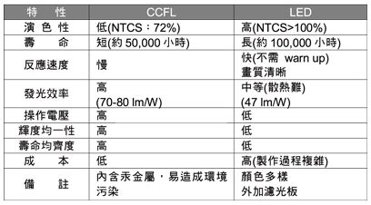 LED因耗電低、不含汞、壽命長、體積小、降低二氧化碳排放量等優(yōu)勢吸引國內(nèi)、外廠商極力推廣取代現(xiàn)有照明。 LED主要照明可分為顯示背光、車用照明、交通號志與室內(nèi)室外照明,而背光模組于2009年被廣泛的應(yīng)用于筆記型電腦面板上,此后亦逐漸被使用到家用電視機,其約占了50%之面板模組零組件制造成本與消耗約70%顯示器之電能,故背光照明為顯示面板最重要的關(guān)鍵。 然液晶顯示器無法自行發(fā)光,因此需要背光模組作為光線的來源,所以背光源的好壞會影響顯示的效果甚劇。 加上面板需薄型化的因素,因此多以CCFL燈管作為背光源,而LED背光源比起CCFL有演色性佳、壽命長、反應(yīng)速度快等優(yōu)勢(如表1)。