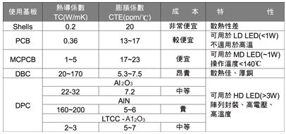 以下將LED散熱封裝材料之比較列于表3,早期LED以炮彈型方式進行封裝,其散熱路徑中有一小部分熱源經(jīng)保護層往大氣方向散熱,大多熱源僅能透過金屬架往基板散熱,此封裝熱阻相當(dāng)?shù)卮?,達250~350℃/W。 進而由表面貼合方式(SMD)于PCB基板上封裝,主要是藉由與基板貼合一起的FR4載板來導(dǎo)熱,利用增加散熱面積的方式來大幅降低其熱阻值。 但此低成本的封裝要面臨的問題是,F(xiàn)R4本身熱傳導(dǎo)系數(shù)較低,膨脹系數(shù)過高,且為不耐高溫的材料,在高功率的LED封裝材料上不太適用。