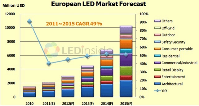 根據(jù)LEDinside調(diào)查, 2011年歐洲 LED照明市場約達20億美元以上,大約占全球 LED照明市場28%。盡管歐洲市場因為歐債而在 2011年有受到影響,但歐盟已經(jīng)積極解決,也反應(yīng)在市場上,隨著LED規(guī)格不斷的提升及大幅度降價等影響,LEDinside預(yù)估歐洲 LED照明市場每年都將會有大幅度成長,2015年歐洲 LED照明市場將會突破100億美元規(guī)模。