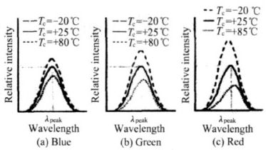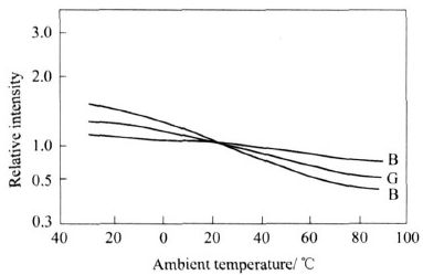 但從LED 的亮度特性圖3 可知,隨著環(huán)境溫度TC 的變化,L ED 的RGB 三基色的顯示亮度偏移狀況各不相同,B 的飄移較小,而R 的飄移較大,當(dāng)溫度超過80 ℃時(shí),R 相對(duì)亮度的變化幾乎是常溫時(shí)的2 倍。這種變化完全破壞了常溫時(shí)設(shè)置的白平衡,使整個(gè)顯示屏的色度發(fā)生嚴(yán)重漂移,圖像質(zhì)量變差。RGB 三基色的相對(duì)亮度的偏移如圖4 示,可明顯看出,常溫時(shí)三基色的亮度狀態(tài)和在85 ℃及- 20 ℃時(shí)的相對(duì)亮度值,正是L ED 的溫度特性導(dǎo)致冬季和夏季顯示屏的圖像質(zhì)量變差。