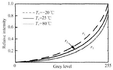 但此方法將損失低灰度級(jí)的亮度,降低了圖像的灰度級(jí),即降低了圖像顯示色彩。為了不減少低級(jí)灰度且保證對(duì)亮度的調(diào)整,提出一種針對(duì)每個(gè)溫度段采用不同的Gamma 參數(shù)來調(diào)整相關(guān)色彩亮度的技術(shù),以補(bǔ)償環(huán)境溫度對(duì)器件的影響。系統(tǒng)針對(duì)不同的RGB 的基色設(shè)置其獨(dú)立的Gamma 反校正參數(shù)。