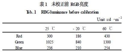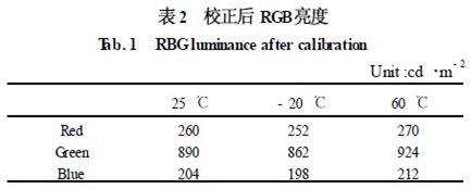 表1 中,常溫的白場配色比例為1. 92 ∶6. 57 ∶1. 51。而當(dāng)溫度發(fā)生變化時(shí),由于LED 的特性,使RGB 的亮度特性發(fā)生了嚴(yán)重的偏移,使白場的比例已完全偏離了常溫下的比例,使圖像在色彩發(fā)生了畸變。而采用本文的校正技術(shù)后,結(jié)果如表2 所示。