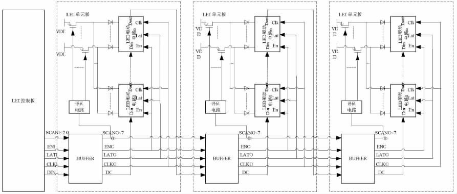 LED 控制板與LED 單元板構(gòu)成的LED 顯示系統(tǒng)的主體,如圖1 所示。其中,LED 單元板包括了增強(qiáng)信號(hào)驅(qū)動(dòng)能力的BUFFER 電路、產(chǎn)生動(dòng)態(tài)顯示掃描時(shí)序的譯碼電路、若干個(gè)開關(guān)管和若干個(gè)LED 驅(qū)動(dòng)電路。其通信過程為:LED 控制板發(fā)出的通信信號(hào)依次經(jīng)過各串接的LED 單元板的BUFFER 電路進(jìn)行驅(qū)動(dòng)增強(qiáng);各LED 單元板中經(jīng)BUFFER 電路增強(qiáng)后的掃描信號(hào)(SCANO)提供給本LED 單元板的譯碼電路,譯碼電路譯碼產(chǎn)生動(dòng)態(tài)顯示掃描時(shí)序控制開關(guān)管;各LED 單元板中經(jīng)BUFFER 電路增強(qiáng)后的使能信號(hào)(ENO)、鎖存信號(hào)(LATO)、時(shí)鐘信號(hào)(CLKO)分別提供給本LED 單元板中所有LED 驅(qū)動(dòng)電路。