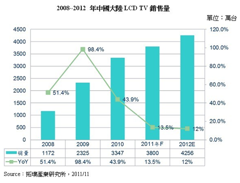 拓墣產(chǎn)業(yè)研究所上海子公司經(jīng)理崔晶分析,中國(guó)大陸LCD TV市場(chǎng)已進(jìn)入成熟期,超高速成長(zhǎng)榮景很難再現(xiàn),預(yù)估2012年銷售量為4,256萬(wàn)臺(tái),成長(zhǎng)率僅將維持在12%。