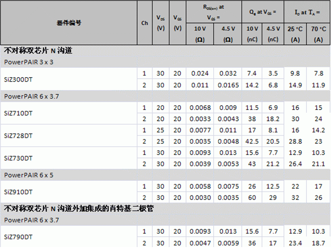 下表提供了所有五款新器件及SiZ710DT的詳細性能規(guī)格。