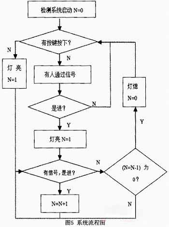 系統(tǒng)流程圖如圖5所示。其中N表示洗手間內(nèi)現(xiàn)有的人數(shù),當(dāng)檢測(cè)系統(tǒng)電源連上后,光電傳感器開始檢測(cè),但系統(tǒng)不知道洗手間內(nèi)此時(shí)是否有人,默認(rèn)是無(wú)人,因而燈是不會(huì)亮的,這時(shí)按鍵可以用來(lái)對(duì)系統(tǒng)進(jìn)行調(diào)整。當(dāng)光強(qiáng)增大到一定值時(shí),檢測(cè)系統(tǒng)自動(dòng)停止工作。