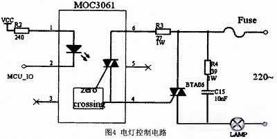 本系統(tǒng)由光電傳感器檢測(cè)洗手間內(nèi)是否有人,單片機(jī)進(jìn)行計(jì)數(shù),當(dāng)N不為零時(shí),單片機(jī)會(huì)向與MOC3061芯片引腳相連的端口輸送信號(hào),然后通過(guò)可控硅來(lái)控制燈的開、關(guān)。其中R3是雙向可控硅的門極電阻,當(dāng)可控硅靈敏度較高時(shí),門極阻抗也很高,并上R3可提高抗干擾能力。 39Ω電阻和0.01μF電容組成浪涌吸收電路,防止浪涌電壓損壞雙向可控硅。其電路圖如圖4所示。