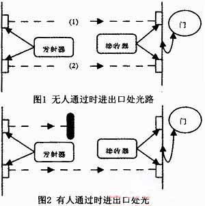 本設(shè)計(jì)的改進(jìn)之處是設(shè)計(jì)一個(gè)具有計(jì)數(shù)功能的模塊,我們可以使用對(duì)射型光電傳感器,如圖1所示在洗手間的進(jìn)口處設(shè)置兩個(gè)發(fā)射源和兩個(gè)接收源,當(dāng)有人進(jìn)或者出洗手問的門時(shí),會(huì)阻擋光線,如圖2所示,接收處就接收不到設(shè)置光源發(fā)出的光信號(hào),這時(shí)接收處的輸出端會(huì)發(fā)出一個(gè)信號(hào),計(jì)數(shù)器就可以通過(guò)此信號(hào)進(jìn)行計(jì)數(shù)。只要計(jì)數(shù)器里存儲(chǔ)數(shù)等于一時(shí),系統(tǒng)控制燈亮,大于零時(shí),該系統(tǒng)就會(huì)控制燈一直亮著,一旦為零,系統(tǒng)會(huì)控制燈延時(shí)一小段時(shí)間后自動(dòng)熄滅。由于整個(gè)系統(tǒng)初啟動(dòng)時(shí)無(wú)法判斷室內(nèi)是否有人,因而我們還會(huì)設(shè)置一個(gè)簡(jiǎn)易開關(guān),供使用者進(jìn)行手控,且為方便使用者能在夜間看到開關(guān)的位置,我們可以采用表面具有夜光性能的材料來(lái)做按鍵。光電檢測(cè)系統(tǒng)的啟動(dòng)由光敏傳感器控制。