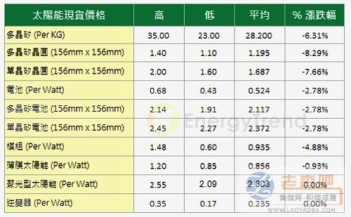 而在電池方面,最低價(jià)格仍來到每瓦0.43美元,平均價(jià)格則滑落到每瓦0.524美元,跌幅為2.78%;另外在模組方面,雖然矽晶太陽能模組的平均價(jià)格持續(xù)下滑到每瓦0.935美元,跌幅為4.88%;而薄膜部分也是下滑的狀況,平均價(jià)格來到0.856美元,跌幅為0.93%。