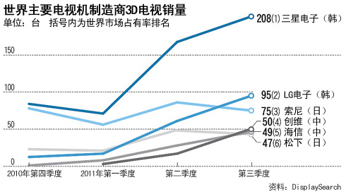 據(jù)市場(chǎng)調(diào)查機(jī)構(gòu)Display Search 20日公布的《第三季度世界3D電視銷量》顯示,中國(guó)有4家企業(yè)進(jìn)入前十,分別是創(chuàng)維(50萬臺(tái),第4位)、海信(49萬臺(tái),第5位)、長(zhǎng)虹(34萬臺(tái),第7位)、康佳(27萬臺(tái),第9位)。
