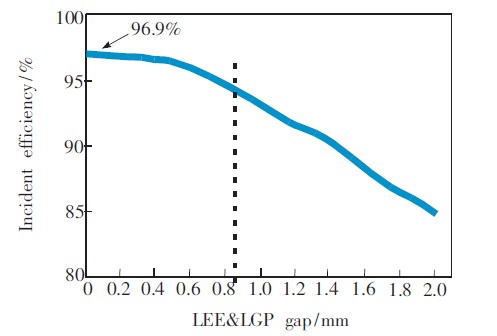 LED發(fā)光面和LGP入光面兩者之間的垂直距離通常會(huì)被忽略,但如果兩者之間的距離過(guò)大,也會(huì)嚴(yán)重影響入射效率。通過(guò)試驗(yàn)發(fā)現(xiàn),兩者之間的距離在±0.2mm范圍內(nèi)時(shí),入射效率變化緩慢,且保持在95%左右,所以控制LED發(fā)光面和LGP入光面的垂直距離在±0.2mm范圍內(nèi)即可。