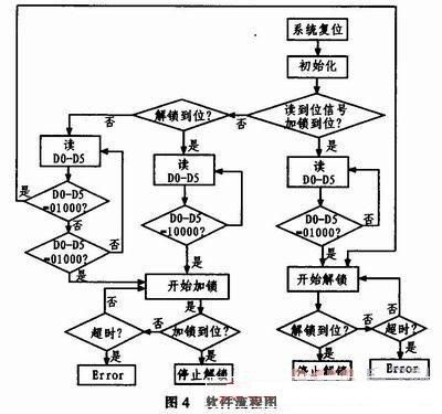 當(dāng)信號D0-D5為10000時(shí),單片機(jī)通過P10口對方位鎖定機(jī)構(gòu)發(fā)出加鎖命令,控制命令經(jīng)SN54LS245驅(qū)動(dòng)后作用于R9和VQ1,VQ1導(dǎo)通后,繼電器K2的4、5導(dǎo)通,輸出+28 VLOCK信號控制電機(jī)進(jìn)行加鎖。完全鎖定后,光電開關(guān)輸出(上)信號輸出高電平即圖3中STOP+,STOP+通過上拉電阻R16作用于R10和VQ2,VQ2導(dǎo)通后,繼電器K3的4、5和8、9導(dǎo)通,+28 V LOCK信號切斷,硬件上先停止加鎖控制,防止造成機(jī)構(gòu)硬件損傷。而K3的8、9導(dǎo)通后,F(xiàn)WH+輸出+5 V電平給單片機(jī),單片機(jī)接收信號后,終止加鎖命令,VQ1截止,K3恢復(fù)常態(tài)。解鎖過程和加鎖過程類似,在此不作贅述。
