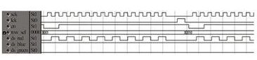 掃描驅(qū)動(dòng)輸出信號(hào)的仿真波形如圖5所示,其中en是灰度控制信號(hào),用來(lái)控制顯示時(shí)間,產(chǎn)生灰度效果;row_sel是行選信號(hào),顯示時(shí)用于確定點(diǎn)亮哪一行;sck是移位時(shí)鐘,lck是鎖存時(shí)鐘,ds_red、ds_blue、ds_green是上屏紅、藍(lán)、綠數(shù)據(jù)的輸入端。仿真時(shí)紅、藍(lán)、綠顯示數(shù)據(jù)分別設(shè)定為01交錯(cuò)、全1、全0。可以看到,在移位時(shí)鐘的作用下數(shù)據(jù)移位正確,移位完成后,lck變?yōu)楦唠娖剑瑢?shù)據(jù)鎖存輸出到LED屏上顯示。