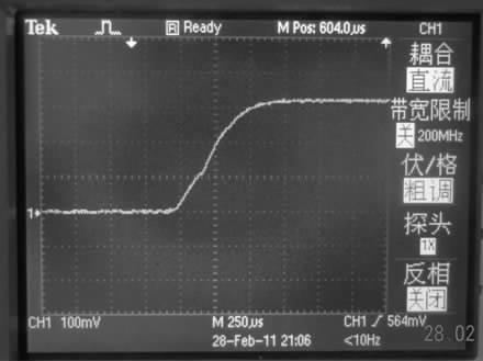 通過模擬可初步選擇40 mH 的電感作為驅動電路所用, 圖3 是用示波器采到的電壓波形圖, 此電壓是電路中串聯(lián)了一個20 Ω 的電阻上的電壓, 穩(wěn)定后電壓為340 mV, 即電路中電流為17 mA.因為實際電路中電流有損耗, 所以實際電流值比模擬電流值偏小, 但整個電流的變化趨勢與模擬基本一致。
