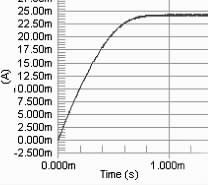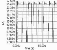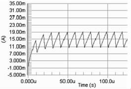要保證PWM 周期小于電感的τ 時間, 因為若PWM 的周期大于τ, 則極有可能出現(xiàn)在PWM 的占空比變化的情況下, 電路中電流都能達到電感的飽和直流電流, 影響了對LED 電流調節(jié)。當C8051330 的時鐘頻率是25 MHz ,PWM 的周期的選擇對電流改變檔位的影響很大。若周期越大, 則PWM 占空比的檔位越多, 反之越少。擬用256 個檔位的占空比, 因此PWM 波的頻率應選擇在100kHz 以下,即周期在10 μs 以上,直流電感為10Ω, 此時電感值應選擇大于0.1 mH.圖2 分別是PWM 頻率為100kHz , 占空比為90%, 電感為0.1 mH、1 mH 和40 mH 時電路電流值的模擬結果。