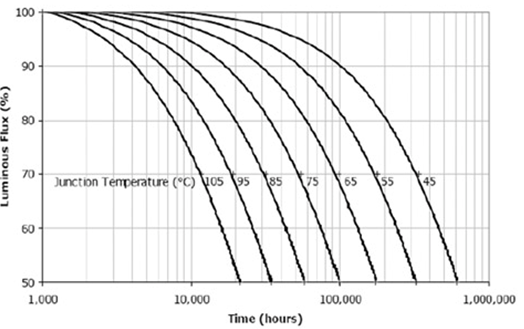 圖1. Cree公司LED的結(jié)溫和光衰壽命試驗(yàn)結(jié)果