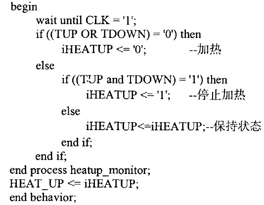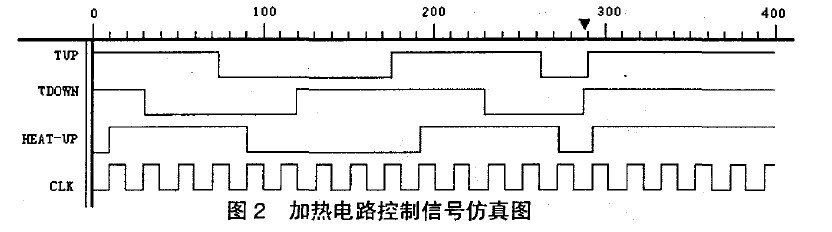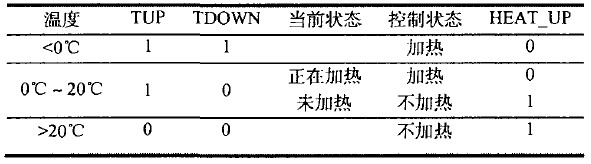 當環(huán)境溫度低于0℃ ,此時TUP與TDOWN均為高電平,FPGA/CPLD輸出高電平HEAT_UP,加熱電路工作。當環(huán)境溫度介于0℃與20℃之間時,如果此時正在加熱,則繼續(xù)加熱,如果當前未加熱,則無需加熱。當環(huán)境溫度高于20℃時,則停止加熱。