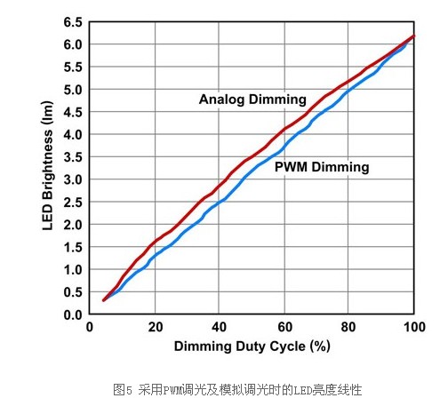 此外,驅(qū)動(dòng)器可達(dá)到較高的光電轉(zhuǎn)換效率,這表示耗用相同的電力可達(dá)到更高的流明。然而,模擬調(diào)光也有深度調(diào)光的某些電流準(zhǔn)確度問(wèn)題,此因回饋調(diào)節(jié)電壓或電流汲入電壓過(guò)小,而無(wú)法準(zhǔn)確控制,此乃受限于錯(cuò)誤放大器的偏移電壓所致。亮度線性及色度也不比PWM調(diào)光,尤其是在深度調(diào)光時(shí)(圖5)。事實(shí)上,除非將兩個(gè)相同的顯示器并置進(jìn)行比較,否則一般人很難辨別色度或線性的差異。